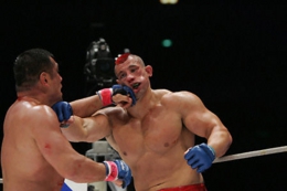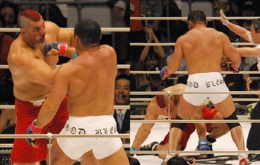 トンプソンはジリジリとプレッシャーかけワンツー、ローキックを打ってくる、なかなかの威力だ、再び突進してきヒザ蹴りなどを的確にヒットさせてくる。タフネスが売りの藤田でも打撃を結構もらっているのでスタミナが心配だ、再び藤田がタックルを仕掛けるがつぶされて下になりトンプソンが鉄槌を振り下ろしてくるのを何とか防御し下から蹴り上げて離れたのを確認し藤田が立ち上がり、突進してパンチを振ると見事にワンツーが的確にヒットしトンプソンの動きが止まった、藤田の怒涛の反撃が始まりトンプソンも必死にパンチを返して来る、お互いガードもせずに無我夢中でどつきあいになり、藤田の渾身の右フックがヒットし崩れ落ちるトンプソンをレフリーが確認し、ノーリミッターの決闘に決着がついた。